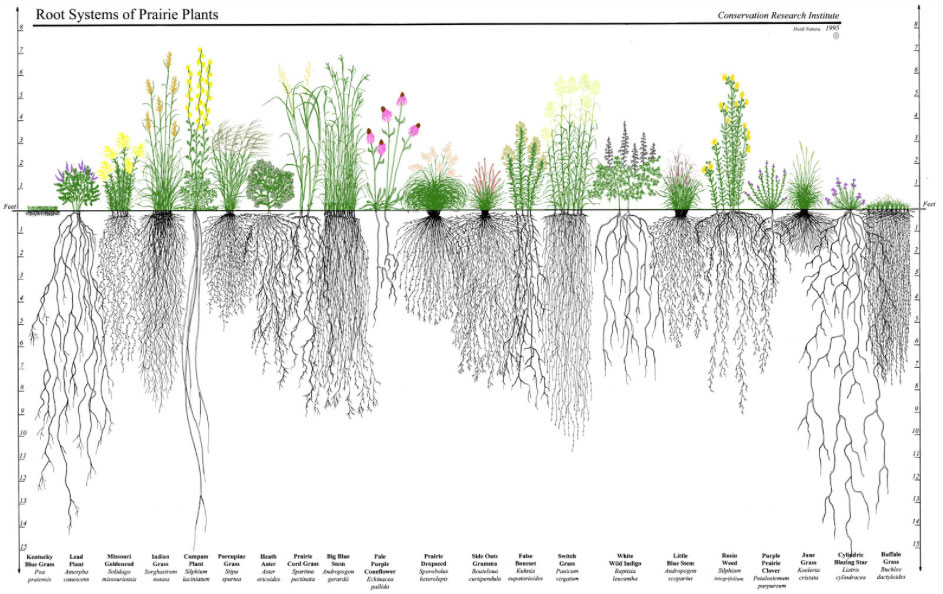 Unlike forested areas, about 80% of the biomass of the prairie is below ground in the deep root systems that plants use to collect water and nutrients from deep in the ground. Forests will generally be the opposite with around 80% of biomass above the ground, mainly in trees and leaves. Many prairie plants roots could reach between 6 and 10 feet into the ground. This allowed for water and nutrients to penetrate deep into the soil. This process along with the organic material that the plants’ extensive root systems shed as they grew created an extremely rich layer of top soil that could be many feet deep.